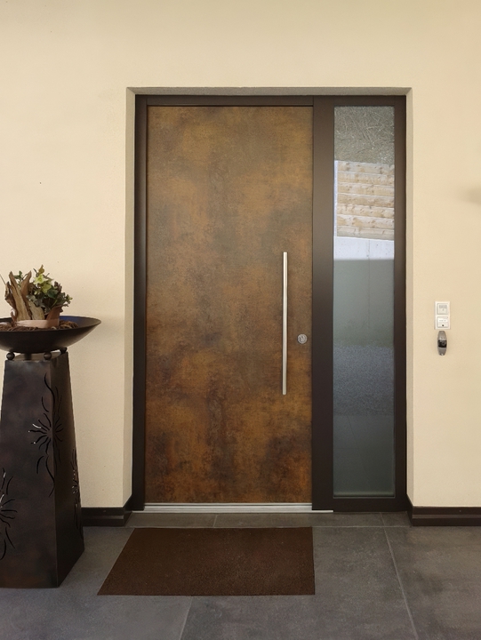 Входная дверь с отделкой жидкой сталью — бронзовая патина LUX-0336